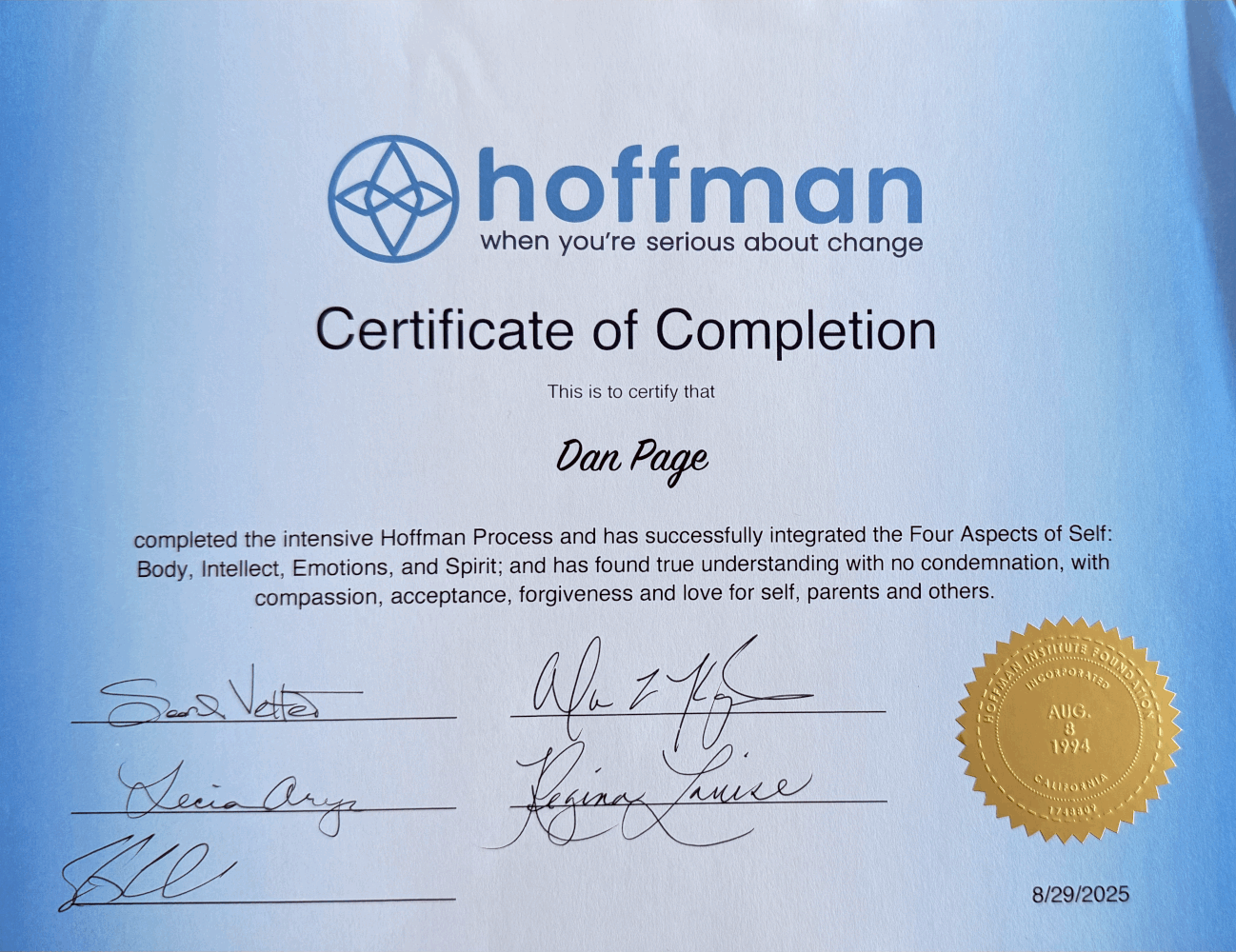 “I pulled out my Hoffman binder this morning and River (my son) saw my certificate in the clear sleeve in the back. He asked if it was my birth certificate. I had to hold back my tears. It’s my mid-life birth certificate. We are getting a second chance to really live this beautiful life in the most authentic way possible.”